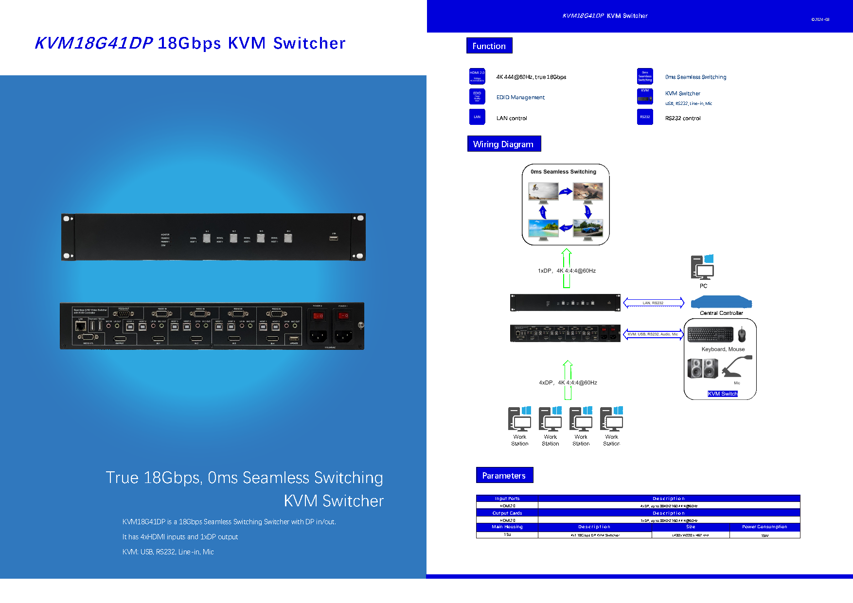 KVM18G41DP: 4x1 4K60Hz User Manual: KVM18G41DP 1. Inputs: 4x(DP+USB2.0+RS232+L/R+MIC) 2. Outputs: DP+USB2.0+RS232+L/R+MIC 3. Redundant PSU 4. 1.5U housing |