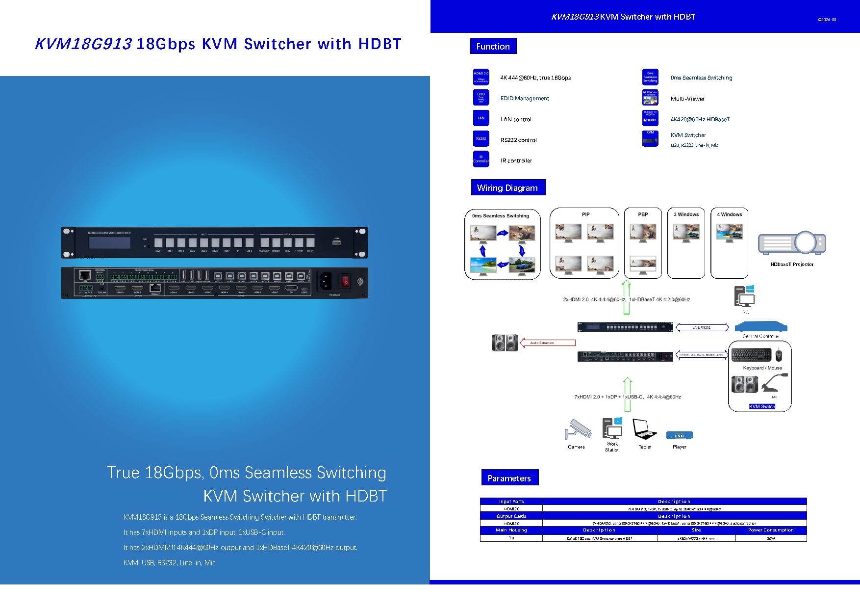 KVM18G913: 4K@60Hz 9x1x3 User Manual: KVM18G913 1. Inputs: 7xHDMI 2.0, 1xDP, 1xUSB-C 2. Outputs: 2x HDMI 2.0, HDbaseT (mirror) 3. Built-in HDbaseT TX, 4K@40m 4. USB2.0, RS232 5. Control: LAN, RS-232, Buttons 6. 1U housing |