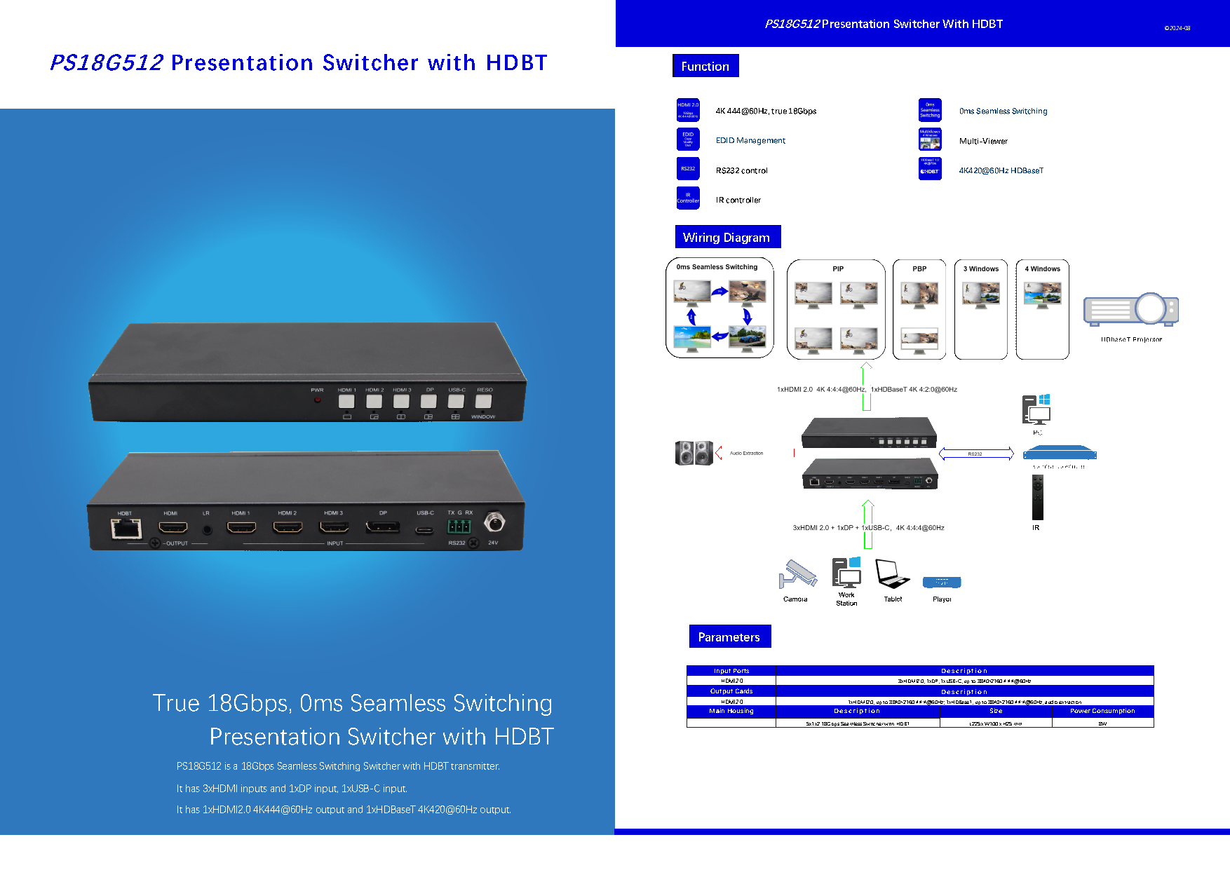 PS18G512: 4K@60Hz 5x1x2 User Manual: PS18G512 1. Inputs: 3xHDMI 2.0, 1xDP, 1xUSB-C 2. Outputs: 1x HDMI 2.0, HDbaseT (mirror) 3. Built-in HDbaseT TX, 4K@40m |
