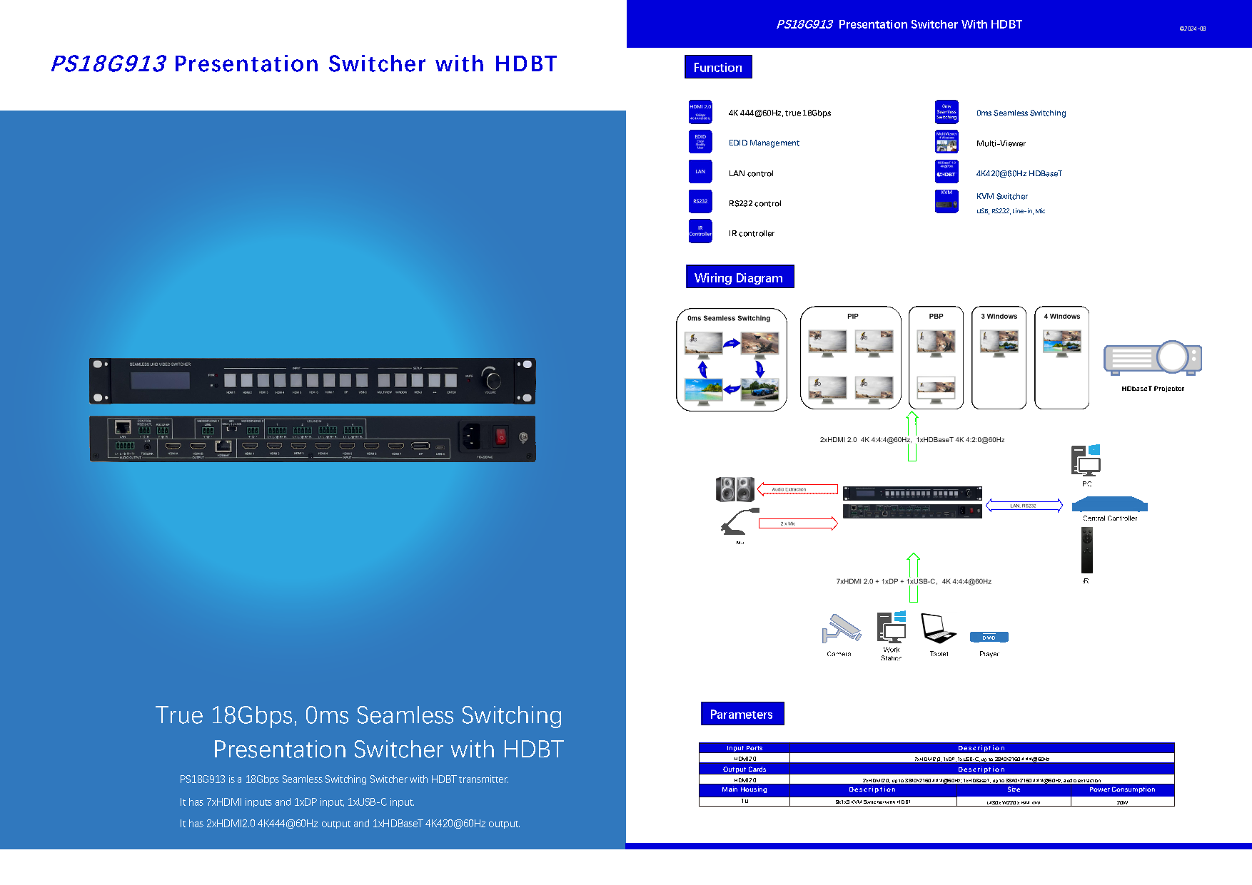 PS18G913: 4K@60Hz 9x1x3 User Manual: PS18G913 1. Inputs: 7xHDMI 2.0, 1xDP, 1xUSB-C 2. Outputs: 2x HDMI 2.0, HDbaseT (mirror) 3. Built-in HDbaseT TX, 4K@40m 4. 2 microphone inputs 5. Balanced stereo audio output 6. Control: LAN, RS-232, Buttons 7. 1U housing |