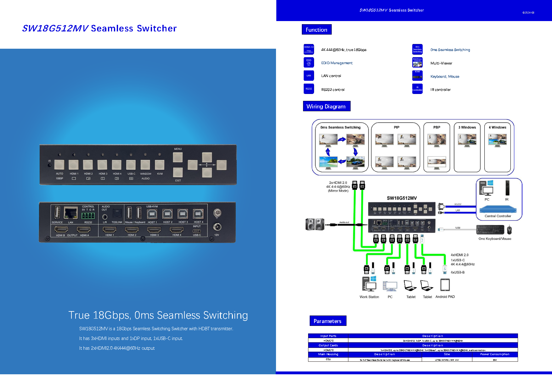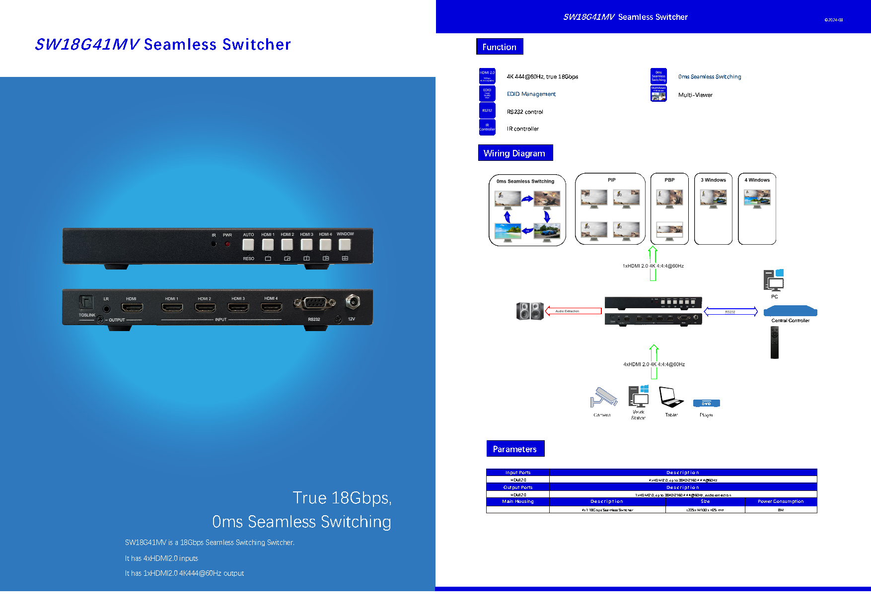 Seamless switcher + Multiviewer SW18G41MV, SW18G512MV PS18G512, PS18G913 KVM18G41DP, KVM18G913 Features 1. Input/output: 4K@60Hz HDMI2.0 2. Single-Window Mode: 0ms Seamless switching 3. Multi-Window Mode: fast switching 4. Multiviewer: 1/2/3/4 windows 5. Audio out-HDMI: Up to 7.1ch 6. Audio out-SPDIF: Up to 5.1ch 7. Audio out-L/R: input with PCM format Customized Resolution for LED |